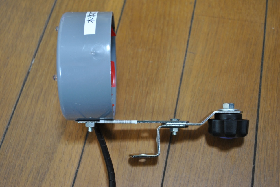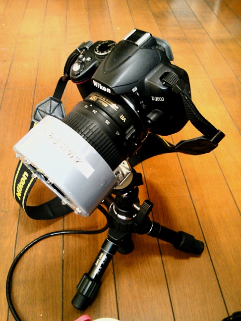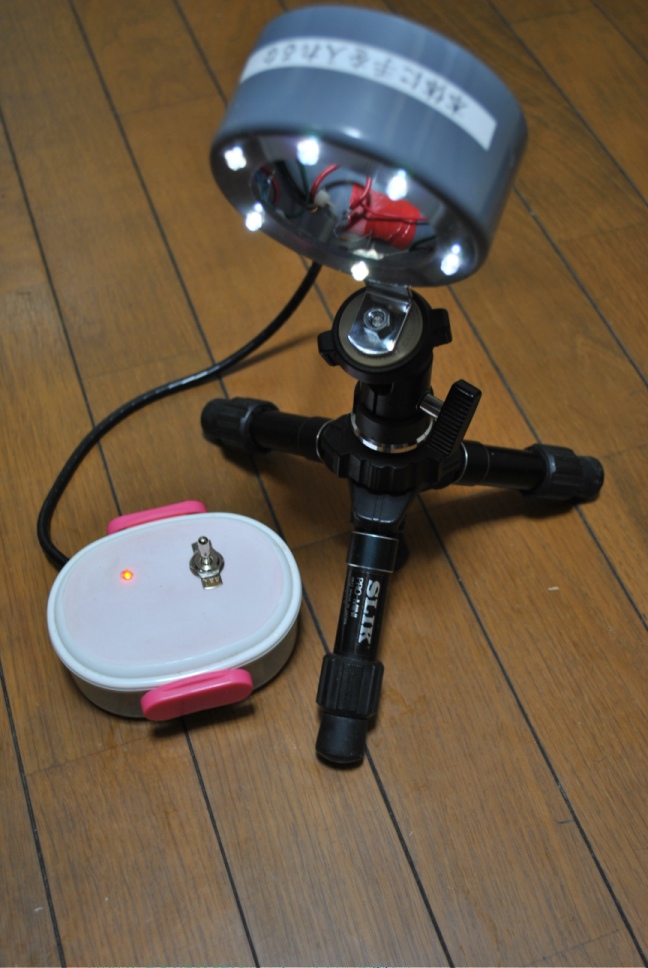 三脚に固定するタイプで横のお弁当箱がスイッチ兼電池ボックス。